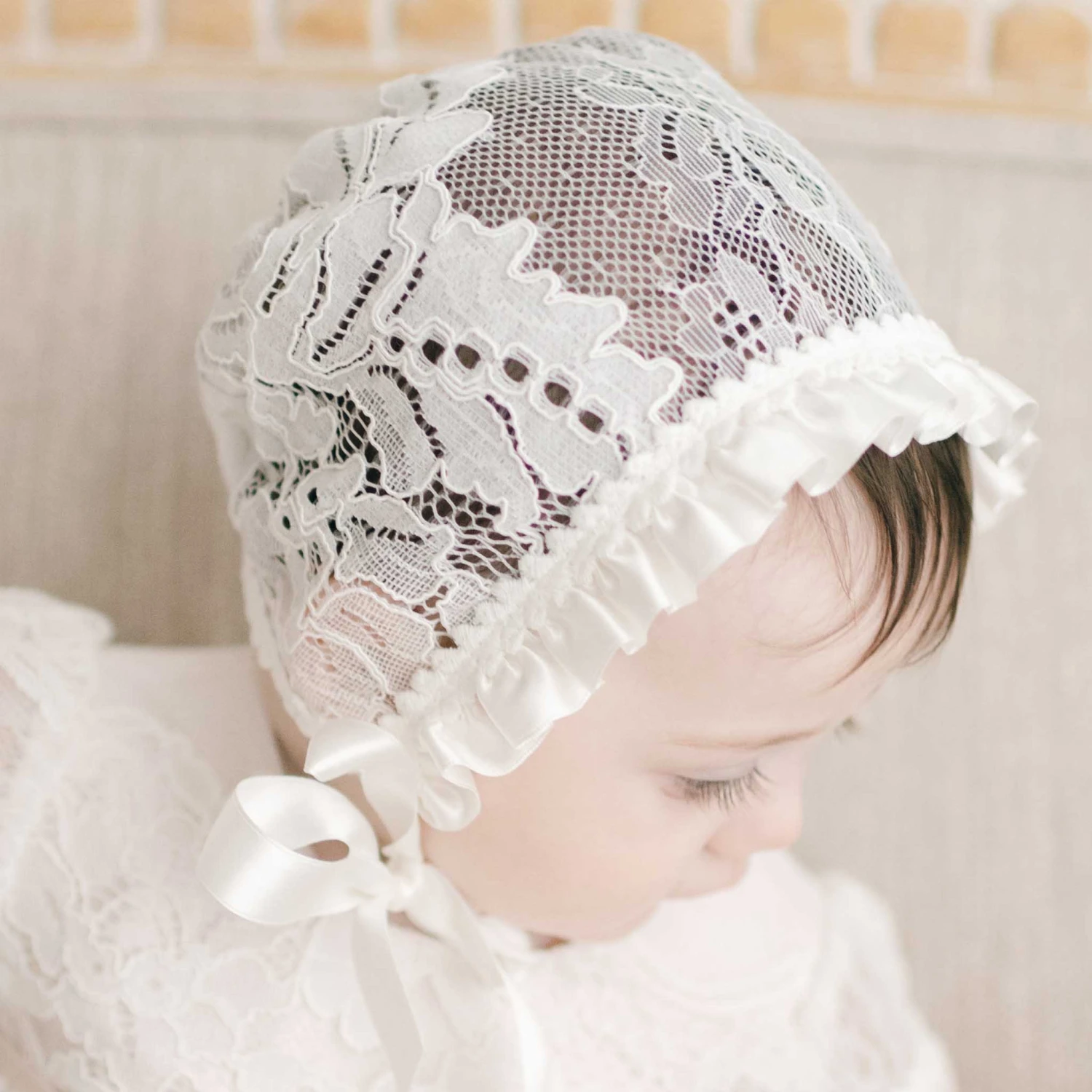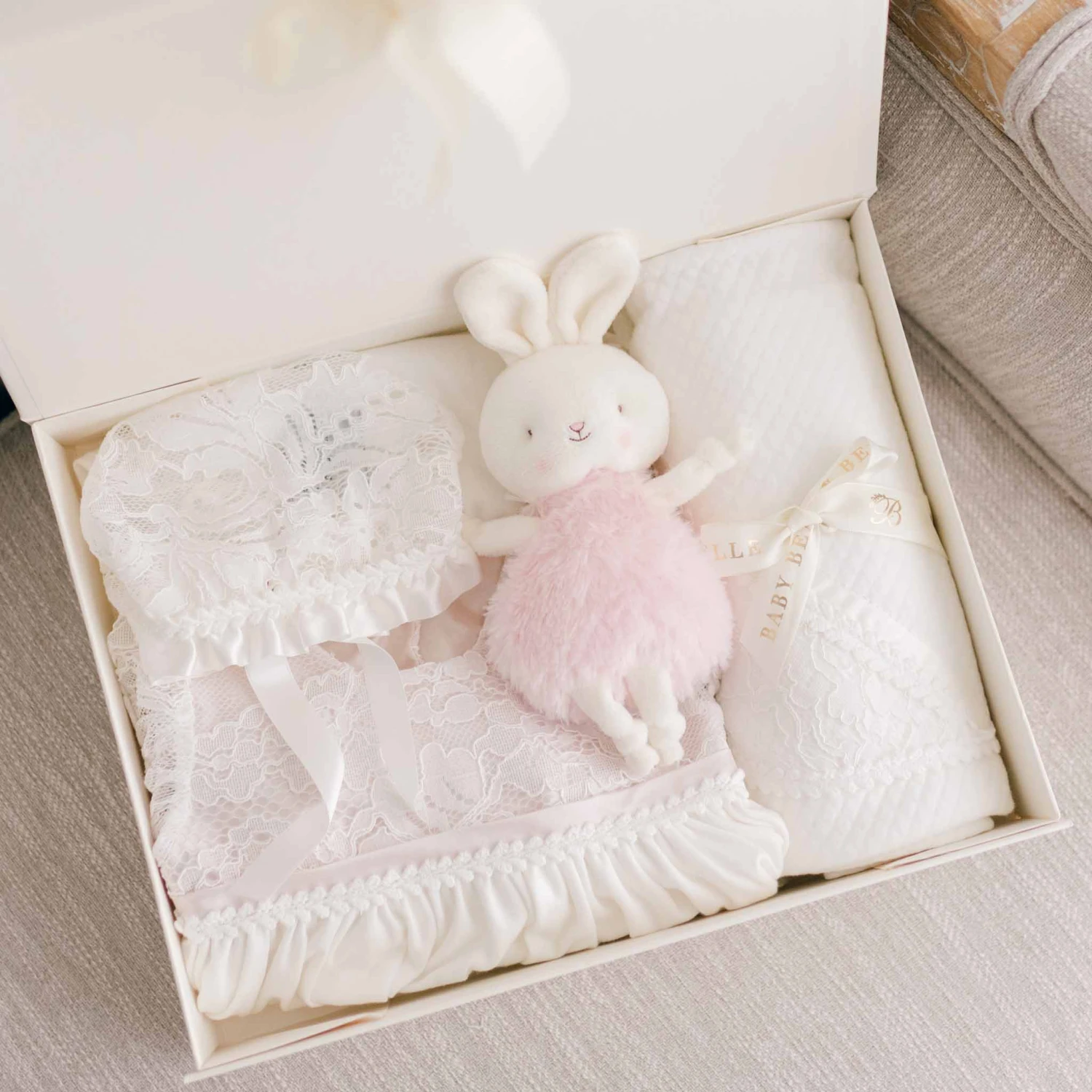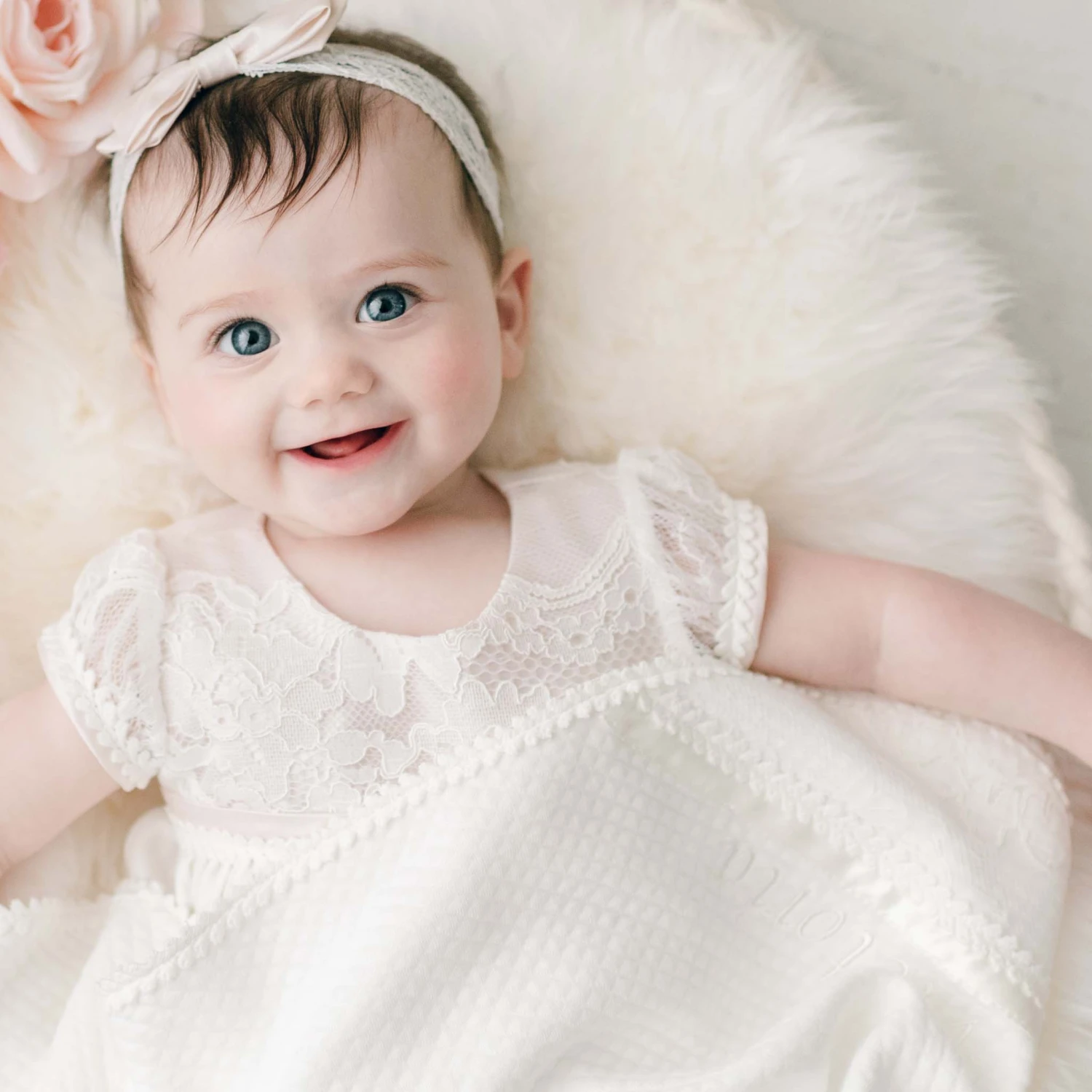 Handmade in the USAWe’ve created this darling newborn set from our Victoria collection that would make a beautiful baby shower gift or for your little girl’s special take me home outfit! The set features our Victoria Cotton Gown – made with 100% ivory pima cotton and detailed with a pink champagne silk dupioni bodice and light ivory Victoria lace. A sweet ivory edge lace and pink champagne silk trim on the sleeves and neck of the gown. This set also includes her matching Victoria lace bonnet, Victoria blanket and bunny plush. Add her first name above the lace corner in ivory thread for a personal touch!