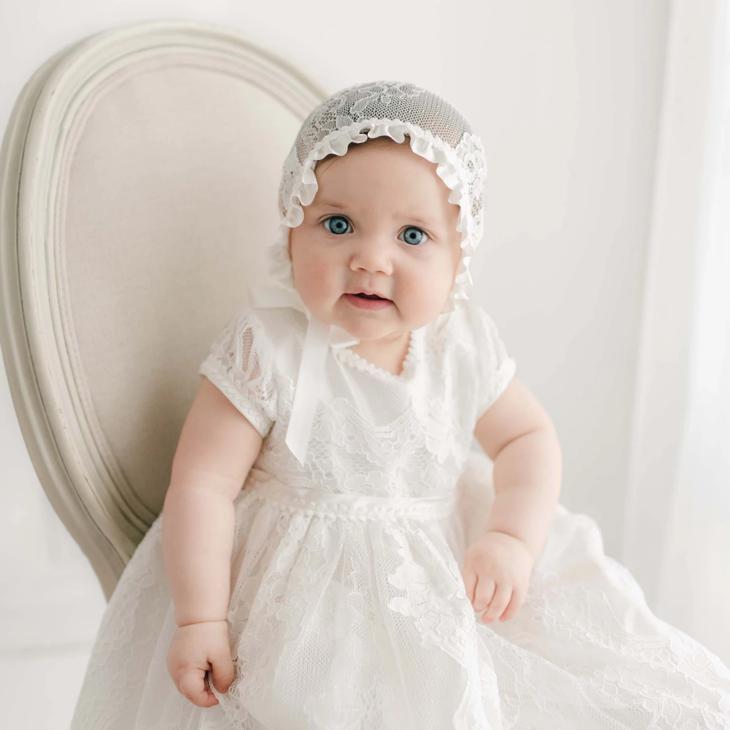 A Baptism gown that is a true work of art. Our Victoria short sleeve gown is handcrafted and beautifully detailed for your baby girl. The soft embroidered ivory floral lace with cording is as elegant as it is comfortable, and its details are enhanced by the beautiful silk underneath. The rich silk Dupioni lining comes in our Vintage Pink Champagne color or ivory for a look that will have your guests thinking it is a family heirloom gown. The traditional length skirt falls well past her toes, and the gorgeous scalloped lace at the hem adds a timeless beauty. A darling floral edge lace and silk trim add depth and richness, while the silk covered summarys at the bodice finish the piece and allow a wonderful fit. Includes her matching Ivory sheer lace bonnet with ivory silk ribbon ties and ruffle that frames her little face perfectly on her Christening or Baptism day. This is a Baptism gown that will be passed down and appreciated for generations to come.