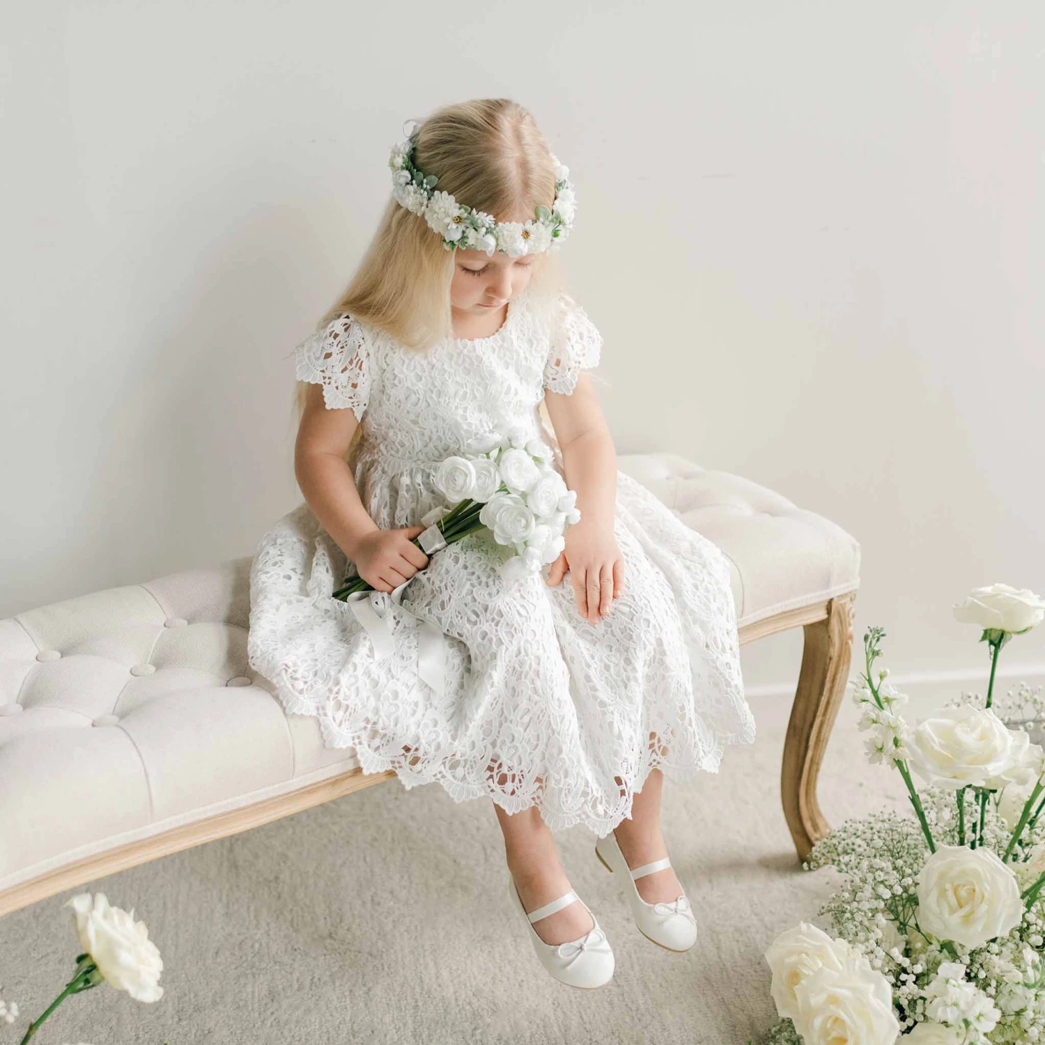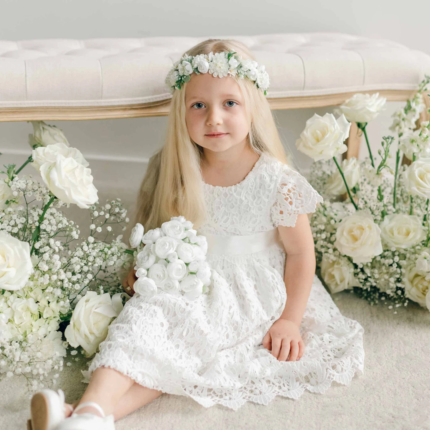 A perfect finishing touch for a flower girl! Our white flower wreath is made with the same white and light ivory flowers as our flower headbands so all your little ones can coordinate! Lined with soft felt so it will be comfortable to wear all throughout the event and party, a light ivory silk ribbon is used to allow for a custom fit when the bow it tied. We leave the ends of our silk ribbons unfinished to keep them soft, so some light separation of the fibers is to be expected with use.